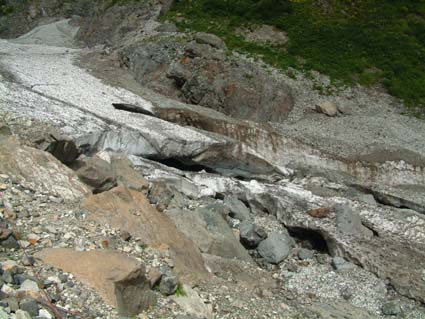 雪渓の終わりに多くのクレパス