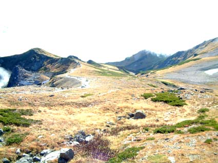 左 中央の急坂を下ると村営小屋が有る☆屋根が微かに見入る