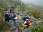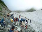 歓喜を上げ話込んでいる 小休憩を取り ガスと晴れ間の交差する登山道を登る AM9:55大雪渓に着くアイゼンを付ける