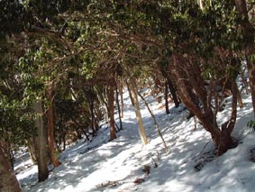 林道を2キロ程登った所に倒木があり進路をふさがれる、仕方なく空き地を見つけ、ここから登山開始、午前11:00先週とは大違いの雪の原である、30センチ位と思うがアイス板の所や吹き溜まりがあり少し歩きにくい11:20分登山口へ杉林を雪を踏みしめ登ること20分モミやアセビの木の混じる雑木林に入る。 |