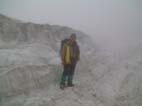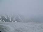 梅花皮岳山頂6:16視界10m程で記念写真を撮り烏帽子岳に向かう 稜線の夏道はすぐに雪渓