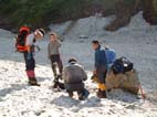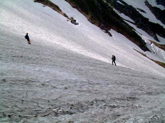 雪渓の中程まで降り 転石に注意しながら休憩 石転ビ出合いPM4:00 後は全員でのんびり話をしながら