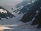 の下へ 方角は有視界は無理 地図とコンパスを使い進む 所々に雪渓が大きな口を開けてる