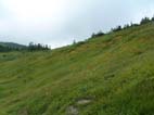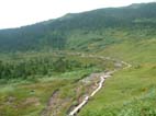 休まずに大凹の湿原に下りる 木道の整備された登山道は展望を楽しみながら歩くことが出来湿原の草花は