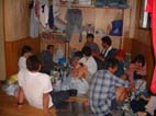 一階の隅に確保したスペースで宴会準備 町子さんと文子さんが持ってきてくれた数多い品々の食材が有り