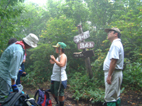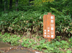 登山道の標識が背景の笹にもたれ案内してくれた 道は泥濘だが自然の環境を大切に保護されており