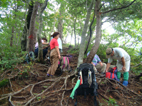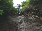 整備された道とは違う感触を楽しみ登ることが出来る 最年少のマサタカ君が早々と泥遊びをしながら登る姿が
