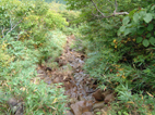 ブナ林の道になり分岐点に出る 最後の休憩を取り滝沢登山口へと下ると渓流に出合い 川の飛び石を使い