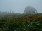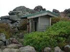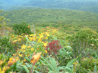 山頂の祠を右に見て緩やかなお花畑の稜線を進む しばらくして振り向くと山頂の小屋が色鮮やかな木々に