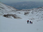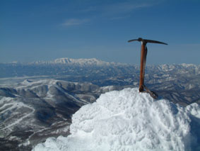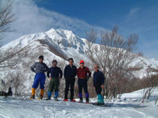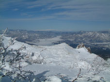 | 春を思わせる陽気に思わずヤッホーの雄叫び 猪苗代スキー場の第4リフト終点より山頂へスタート 積雪2mを越す山腹 いきなりのラッセルに悪戦苦闘のメンバー 稜線に出て一息 猪苗代の町を眼下に眺め 展望を楽しむ 磐梯山は青空に天を突き刺す勇壮 赤埴山をトラバースして小休憩の面々 |
