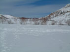 | 鏡ヶ池を雪の下に眺め スノーシューの足取りも軽やかに沼の平に付く 一面が雪に覆われ山々が近くに見える 此から登る急斜面を考え 腹ごしらえと水分補給をする 見た目は其れほど角度を感じさせないのか余裕の面々 |