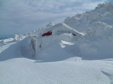 | いざ黄金清水に向かえ 急登に差し掛かると悲鳴を上げる一こま 休まずに弘法清水に進む 直登を試み 雪面を噛みしめながら歩くが カンジキの佐藤さん時折抜ける雪面に疲労困憊の模様 清水小屋はすっかり 凍り付き雪の着ぐるみで覆われていた |