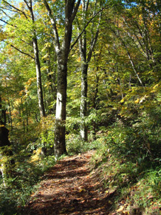 | 道は小石が埋め込んで在るように見える ブナの林が新鮮な空気を生み出してる 道の下には雄子沢があり 水の流れる音がリズムに乗り聞こえて来る ゆっくり歩きマイナスイオンを体に補給しよう |