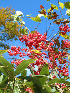 道ばたには青空に映える木の実が 赤と空の青と木の緑のコントラストが眩しく輝いていた |