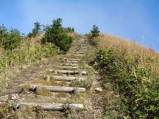 | 緩斜面の道を一時間半ほど歩くと 木で補強された階段状の道に出る この階段を登ると猫魔ヶ岳と雄国山のコルに 出る コルは広く右手には雄国山の山頂が 目に飛び込んで来る |