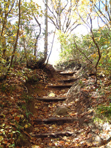 そうこう言ううちに最後の急な階段に出る 此処を登れば山頂まで300mである がんばれ もう少しだ |