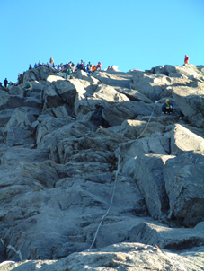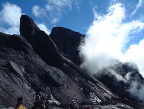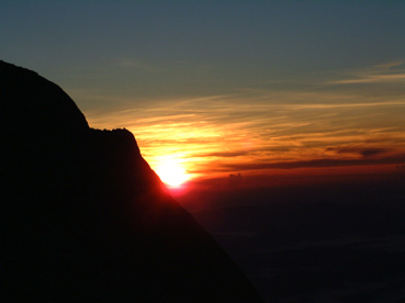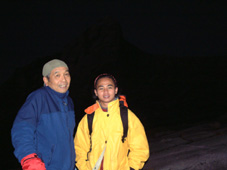 11月3日 ラバンラタ小屋をAM2:30出発(3300m)〜ロウズ・ピーク(4095.2m)にAM7:30到着 下山AM8:00〜ラバンラタ小屋到着AM9:20(朝食)〜休憩〜小屋出発AM10:30〜 ティムポホン登山ゲート(1866.4m)PM1:30到着 ![]() South Pcak(サウス ピーク 3921.5m) AM1:00起床 SEIの腹痛は治まった様である だが 体が ふらふらと力が無い このままでは山頂を踏むことが出来ないと ソーセージ一本を無理に食べる 胃の調子が悪い (>_<) ![]() 暗闇の稜線 ガイド & TETU AM2:30ロウズ・ピークを目指して出発だ 急な階段 ヘッドライトの灯りを頼りに登る まだ木々の背丈は高く展望は無い 目の前に迫る大岩 薄明かりの中に先行者の光が見え隠れしてる 一枚岩の雄大なキナバル山を踏む 期待と夢を現実の物にするために進む 体長が悪い力が入らない 意識だけが足を前に出させてる・・・ サヤッサヤッ小屋(3668.1m)にAM5:40 此処で登山者カードの 確認を求められた 厳しい検問である 「一日の許可入山者をチエック」 ![]() キナバル山の日の出 ヘッドライトの灯りも要らなくなり 歩きやすい ただ 急な一枚岩の為にロープが張られコースを外れない様にされて居る 気を抜けば滑落は間違いないだろう 確実に足場を確保して進む セントジョンズピーク(4090.7m) ![]() キナバル山 最高峰 Low`s Peak(4095.2m)への挑戦 朝日が東の空を照らし出した雲海が赤く染まる トウンク・アブドウル・ラーマン・ピークのシルイットが大岩に影絵となり浮かぶ そしてドンキーズ・イヤーズ・ピークも 太陽が顔を出す素晴らしい光景だ 広大な大地をさまよう様に歩く登山者が 夢に見た幻の様に サウス・ピークの尖った形 セント・ジョンズ・ピークの丸い形 そして憧れのローズ・ピークが目の前に姿を現した ただ興奮とピークを 早く踏みたい気持ちが先走り 回りの景色を見るゆとりが無い ![]() 山頂の登山者 ![]() 上の左から TAKE 中央 Hayasaka 右 Takizawa 左から ガイド・SEI・Takizawa・TETU・KEN ガイド 写真を撮ってるのは Furuno ピークには先行者の姿が多く見ることが出来た AM7:30到着 此処がキナバル山の山頂と大きな声で自分に語りかけた 感激の瞬間である 先行のKENさん・TAKEさん・HAYAさん・TAKIさん ご夫婦に続き TETUさんとSEIが拍手と握手で向かえられた オメデトウキナバル山 有り難うマレーシア最高峰キナバル登頂 体調不良にも係わらずピークを踏めた事に 今までにない 満足感を味わう事が出来ました ![]() 氷河期に削り取られたと伝えられてる山容 下山(余裕のTETUさん) 30分位の休憩の後に下山 一枚岩には白のロープが張られて迷う事は無い 下山時は回りの風景や遠望そして大地の肌を じっくりと堪能する事が出来 余裕の歩きに成る ![]() 巨大な一枚岩の山様 畏敬の念を起こさせる山並み 雲が沸き上がる様に押し寄せる そして消える 風がささやく耳元で 帽子が飛ばされる風のいたずら 心が笑う子供の様に 全てが達成された満足感なのか 山頂付近ではTETUさんのカラスの鳴き声 力が無く 高山病に係ったカラスとみんなの笑いを誘った 順調に下る アクシデントが一度在ったが怪我も無く全員無事にパナール・ラバン小屋に着く 時間の関係で到着後直ぐに朝食を取り 小屋を後にした 山頂の雲一つ無い空間 広大な岩の山 高山植物の数々 平地の温度(30度)と山頂の温度(1〜8度)の温度差と 今まで一度も経験できなかった自然に感謝して キナバル山の道を楽しく下るハッカ山苦楽部の面々でした 4日目を終了 次のページに続く |