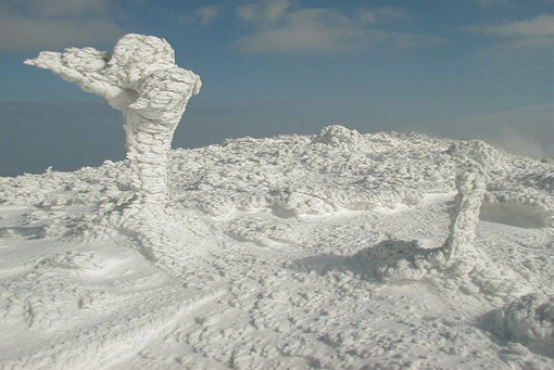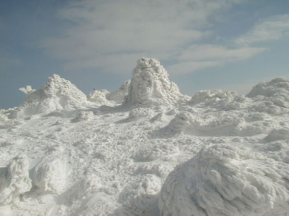 山頂の道標も氷付いてる