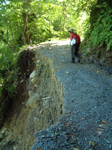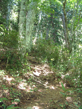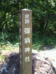 崩れた道を怖々と覗き込む 二岐温泉より登山口まで歩く 登山口に着く 荒れた登山道 ブナ林が続く サンサンと降り注ぐ太陽 ![]() 御鍋神社の道標 鍋が奉られている御鍋神社 ![]() 雲一つない空 秘湯大和館