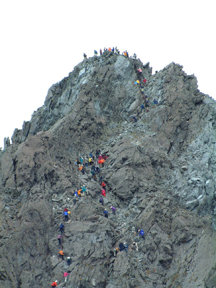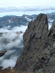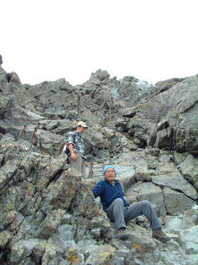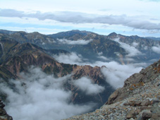 ![]() 草紅葉の始まった登山道 坊主岩を越すともうすぐ其処に槍が ![]() 山頂より三俣蓮華岳方面を望む 小槍 越しに見る漂う雲海 NOBUさんと眼下に槍岳山荘 祠の前でご機嫌のSUMIさん ![]() 沸き上がる雲 東鎌尾根の稜線にはヒュッテ大槍が ![]() 山頂より常念岳 穂先より降りる二人(手前は尻餅のSUMIさん) ![]() ヒュッテ大槍に着いたNOBUさん・SUMIさん・SEI ![]() 雲のジュウタン下界は雨かと前穂の頭 槍見河原で会った名古屋のグループと同宿(カンパ〜イ) 22日AM6:40槍沢ロッジを出発 小高い木々に被われてる登山道で展望が無い 槍沢小屋跡に着くと進むことが出来ない位のテントが張られてた 水俣乗越分岐 辺りになると紅葉の始まりで色づく木々や草で眩しい輝きの山肌が出現する 大曲を過ぎると急坂の始まりだ 休む回数が多くなる高度を上げて進む お花が綺麗だそしてナナカマドの紅葉 ジグザグに登る道 坊主岩で小休憩を取る 右には殺生ヒュッテ 急坂の先には槍ヶ岳と山荘が目の前に見える 槍の肩にはAM11:05到着 直ぐに穂先に登るが 多くの登山者の為に進まず岩に持たれて 待つ時間が多い 梯子とクサリに助けられて山頂に着く 山頂からのパノラマは うねる雲上に見せる峰々 360度の展望これは圧巻と息を呑む・・・ とぎれる事の無い登山者の為に長居は出来ない 未だ山頂の興奮冷め止まないうちに降りる・・・焼付く展望の数々を胸に抱き 肩まで降りて小屋で休憩 生ビールとカレーを注文して満足の時間が過ぎてゆく ヒュッテ大槍にはPM2:05到着 フロントには若いお嬢さんがおり 優しい言葉と笑顔のお迎えに北のアルプスの 満足感が大きく膨らんだ 小屋で食事までの時間を楽しんでると 槍の肩で約束をした名古屋の5人のパーテーが 遅くなりましたと歓喜のの再会 楽しい時間の始まりが此処に・・・ 小屋には単独登山で神奈川のTHさんと埼玉の元気なお姉さんが意気投合 山談義に花を咲かせて つい時間が過ぎるのを忘れる 食事の時間そして許されるギリギリの時間まで語り明かした 次のページへ |