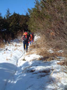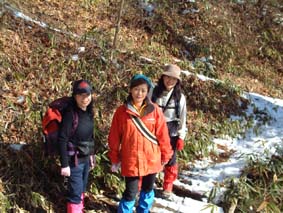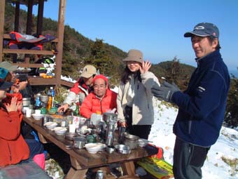 ![]() 登山口にて 左からTAKE・TETU・Sho・NOBU・HIRO 前列左からKOBA・MAKI・SIN・ ![]() モミの木の巨木林 南の山も残雪の歩きに 左からSIN・KOBA・MAKI ![]() 山頂にて(展望が無い) ![]() ロマン広場の展望(中央が三森山) ![]() 太平洋の眺望 ![]() 東屋は雪化粧 食べきれない程の食材です ![]() KOBA&SIN 煮込みうどんが美味しいHIRO・TAKE幹事有り難う ![]() 2時間の休憩を楽しみ下山の途につく(^^)/~~~(^^)/~~~ ![]() 参詣清水 福島県大熊町の坂下ダム登山口より登る、太平洋に近く暖かい山あるきでした リハビリ登山も3回目 ハッカ山のメンバー9人の楽しい行動に足の痛みも忘れてしまう 風も無い冬には珍しい穏やかな日、太陽の日射しを全身に浴びて進む 登山口直ぐに杉林の登りで 今回の登山道では一番の急登になる 日射しが時より差し込む中 残雪の道を気持ちよく登る、1時間位あるくとモミの木の林になり 大きなモミの木が山の歴史を語りかけてくる、此処はかって塩の道として多くの人が行き交う 重要な道であったと言い伝えられてる 左右が灌木林になり時折、遠望が可能に成る、参詣清水を左に見て巻き道を山頂に向かう 右にポッカリと空間が!!望洋台である太平洋を一望でき暫し足を止める事になる場所です 望洋台を後にして間もなく稜線のピークに、山頂かと思いきや偽ピークでした 次に現れたピークTAKEさんが此処が山頂と自信満々?? これも偽ピーク、三度目のピークが山頂でした 山頂は展望が無く記念写真を撮り直ぐにロマン広場のある展望台に下山 30分で到着、下山途中は木に積もった雪を揺すって悪戯のTETUさん雪まみれのNOBUさん 登山を2倍楽しくする名場面でした ロマン広場に着く早々みんなでカンパイお疲れさんと喉を鳴らす 用意されたテーブル一杯の食材、幹事のTAKEさんHIROさんが手際よく準備に係る 辛みの強いおでん、大好評でした そしてホット赤ワインや煮込み雑煮やうどん 最後に餅を入れて食べる、2時間にわたる大宴会でした ロマン広場を後に参詣清水に着く、あとは来た道を下るだけである 午後に成っても太陽は照りつづけ全てに満足する冬の一時でした、9人のメンバーの合い言葉は 本当に楽しい登山でしたと!!帰りは夜ノ森に在る温泉施設で汗を流して帰途に付きました。 9人の楽しい山旅を有り難う 次も楽しみましょうね・・・SEI