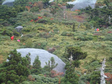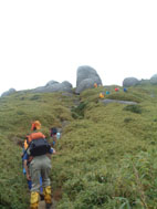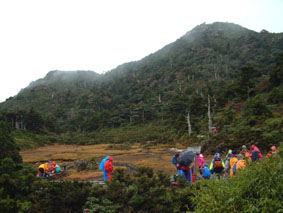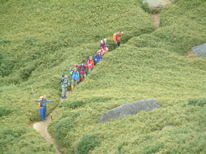 山頂を後にするメンバー(笹のジュウタンの中で)