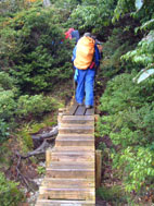 シャクナゲの生え茂る登山道 世界遺産の落とし子か至る所が木道で整備され