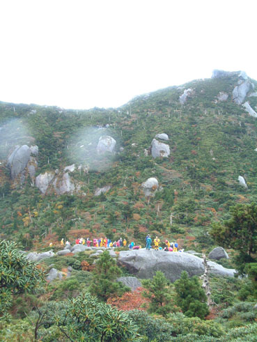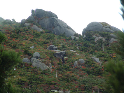 中央奥の岩に棒の様に見える登山者(宮之浦岳のピーク)