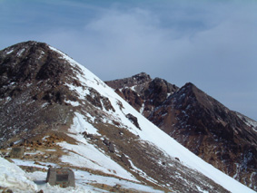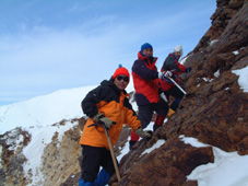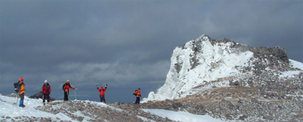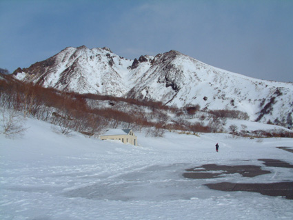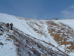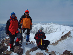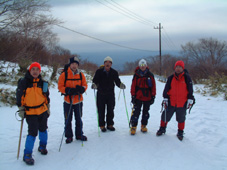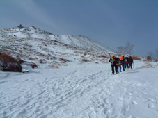 ![]() 大丸温泉を出発する 左からHIRO・ARIGA・KEN・Sho・TAKE 峠の駐車場より朝日岳 ![]() 茶臼岳を左に雪原を登る 稜線に見える峰の茶屋 小屋より望む 左が剣ヶ峰 右に朝日岳のピーク ![]() 那須連邦の奥に 南会津のシンボル燧ヶ岳や三岩岳が木漏れ日に輝いて居た ![]() 剣ヶ峰のピーク クサリ場を登る 朝日岳の肩で 左からHIRO・Sho・TAKE ![]() 茶臼岳 中央に三本槍岳 右奥に須立山 ![]() 朝日山頂で左からTAKE・HIRO・Sho ![]() 稜線越しに福島県のシンボル磐梯山が浮かぶ ![]() 茶臼の外輪を歩く 茶臼岳の山頂で 左からARIGA・KEN・TAKE・HIRO・Sho 全国的に曇りとの予報の中 栃木県大丸温泉からコースを取り那須岳に登る 高曇りの空 日射しは無いが山の稜線はクッキリと見える 夏道には圧雪され雪が1〜2m位あるが 安定してる 雪面は凍って居るようなので全員アイゼンを付けての登りになる 夏道を横切りどんどん登る 30分程でゴンドラの駅に着く 夏には大勢のハイカーで賑わう場所も今は誰も居ない 閉ざされた駐車場は一面雪の原で 春を待つ後わずかな時間を大切に大地一杯に呼吸をしてる様に見えた 朝日岳を正面に見ながら進むと 峠の茶やが軒先まで雪に埋まり未だ来ぬシーズンに一休み 石の鳥居を過ぎると やや登りがきつく成る それもわずかな距離で終わり 間もなく茶臼岳の山腹を巻くように緩斜面を登る ケルンの在る場所まで来ると正面に峰の茶屋が確認出来る 此処は強風の吹く場所で有名 去年の今頃訪れた時に私は強風に飛ばされて怪我をした場所である。 今日は雪は締まっていて歩きやすく風は殆ど無い 今時期には珍しい!! 峰の茶屋には登り初めてから一時間四十五分で着き小休憩 間もなく鋭いピークの朝日岳に誘われて登り始める TAKE・HIRO・Sho・SEI 剣が峰は夏道は通れずピーク越え 30度位のガレ場を登りピークに在る目印で写真を撮った 安定しない足場を一歩一歩下り コルに出る 雪の残る岩場は要注意 クサリの張られた登り 切れ落ちたエッジ スリルと興奮の通過に遠望を楽しむには余裕が無い (>_<) 道標の在る稜線に出ると間もなく朝日岳の山頂まで15分位で着く 無風の高曇りの天候に遮る物は無く 流石山の峰峰 三本槍の勇壮 白く輝く磐梯山 南には燧ヶ岳や三岩岳と視界に飛び込む 20分間 山頂は極楽の天童に ときめく心をなだめて下山 私は剣ヶ峰の夏道を下る が 40度は在ろう斜面の雪は腐れ初めてて 雪がアイゼンに張り付く 滑る 前進を諦めて剣ヶ峰のピークを目指し直登 滑る岩場は恐怖ものでした・・ 峰の茶屋で食事に 持参したワイン・ビール・ウイスキーと持ち寄った食材は テーブル一杯になり一時間のランチタイムでした 後半の目指すは茶臼岳 黙々と上がる噴煙は圧巻きだ アルコールの入った体は正直で運ぶ足は鈍く 息が切れる TETUさんの気持ちに成った(笑) 山肌は至る所から噴煙が上がり冬ならではの光景と新鮮な大気は茶臼岳の特権か 山頂の祠に手を合わせ無事に下山の途に着く 茶臼岳の冬の近道 夏には下れない雪原下り 峠の茶やを目標にガンガン下る 他のメンバーがケルンを巻いて下った為に 早く着きすぎた SEI は暫し一人で 駐車場で待つ事に成りました 初登山のARIGA君 ピッケル&アイゼン初のShoさん お酒好きのTAKEさん 堅実なKENさん 元気なHIROさん 今日も楽しく登れました 有り難う・・・・SEI