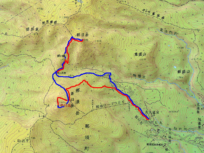 那須岳(朝日岳・茶臼岳) 青 登り 赤 下り 大丸温泉8:00〜峠の茶屋8:50〜峰の茶屋9:45〜休憩10分〜朝日岳山頂11:00 休憩 20分〜峰の茶屋12:00〜休憩 13:00〜茶臼岳山頂14:00〜登山口15:30