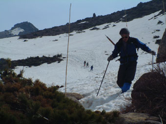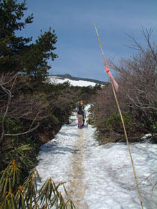![]() ゴンドラ終点に在る登山道入り口の道標 残雪の中 山頂(中央の凸)を望み歩く ![]() なだらかな山容の安達太良山 ![]() チョット・・・休憩 青空の下で ![]() 冬期間に使われていた目印の竹竿が道標に括られていた 和尚山への稜線(奥に見えるのが和尚山) ![]() 山頂で左から INO・SEI・KAZU ![]() くろがね小屋へ続く登山道が中央に 奥には荒々しい鉄山の稜線 ![]() 雪渓の上にKENさん 急斜面でダイヤモンド走行の目印を置くNOBU ピッケルによる制動訓練 ![]() アイゼン歩行や滑落停止訓練 ![]() 間もなくくろがね小屋へ 岡部会長が先頭に後方を歩くメンバーの姿が見える ![]() 登山道より眼下にくろがね小屋 小屋の中でくつろぐ 左手前からNOBU・OKABE・KAZU・INO・KEN ![]() 下山道より箕輪山 ![]() 左からHAYASIさん・NOBUさん OKABE会長 ![]() 奥岳駐車場に着く1km位手前の道路左右にはカタクリの群生地帯が在る 山頂直下で2時間40分にわたる雪上訓練は初めての試みで在り 岡部会長 NOBUさん ご指導有り難うございました 充実した一日を過ごせてメンバー全員が満足したと思います これからの登山行動に力強い経験が出来たと思います 有り難うございました 参加者 OKABE・KEN・NOBU・KAZU・INO・SEI