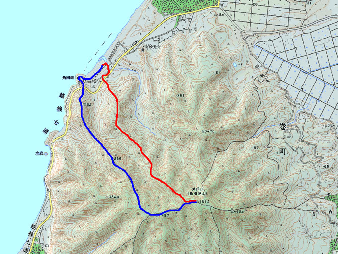 今回のコース 登り 赤の線(地図上に無い為 さだかでは無い) 登山口 AM10:00〜山頂 PM12:00 休憩(12:00〜13:30分) 下り 青 (灯台コース) 下山 13:30〜駐車場 PM15:00