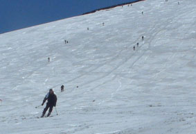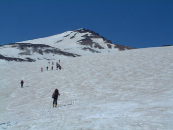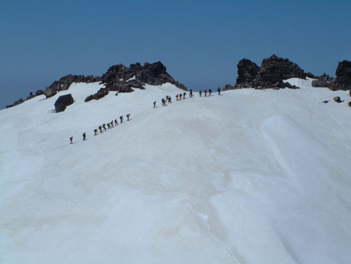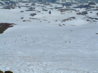 鳥海山に山スキーで来たのは初めてです 郡山を2日のPM7:00出発〜祓川駐車場に12:00到着した 以下同行したShoさんの記録です 5月2日、19.00郡山予定通り出発 東北道、古川IC〜R47 R108の入る所が分からず そのままR47にて新庄へ鳥海町より祓川へ 登って行くと 両側、雪の壁 駐車場に24.00着 すでに十数台 空は満天の星空、鳥海山がしっかり見える。 早速宴会1.30仮眠 5.30Sho起きる、晴れ 風無し。目の前のバーンに圧倒される。 [山が逃げる]とSEIを起こす。駐車場にて Sho〜 安達太良で会った須賀川の人に会う SEI〜東北メーリングの仲間に会う 6.30登山開始 途中郡山からの3人組みに会う 頂上着10.40 宴会 どんどん登って来る 12.10下山 この広いバーンをどの様に滑って降りるか 迷う、もったいないと思いつつ滑りはじめる 雪質はザラメ系で滑りやすい、祓川ヒュッテ14.40着 駐車場へ 車でごったがえしている。 瀬見温泉へ民宿古木屋さん だんなさんの採った山菜、鮎、かじか等そして地酒 楽しかった鳥海山、瀬見温泉でした。 SEIさnありがとうございました。 |