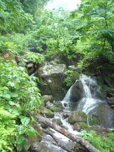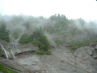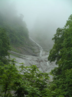 ガスの中から現れた一筋の滝 一枚岩の滑の流れは雨のもたらす 技なのか それともブナ林の伏流水か!! |