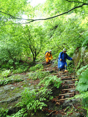 ![]() 急な登山道を慎重に降りる |