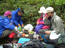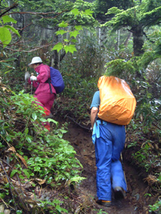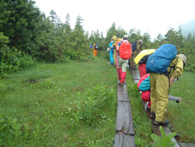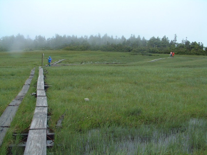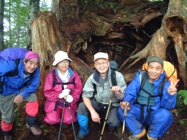 ![]() ![]() 小雨の中出発 TETU・KAZU・Sho・TAKI 屋久杉の株の様な根 ![]() 大きな根の前でSho・TAKI・KAZU・TETU TETUさんの見開いた目が不気味(@_@) (笑) ![]() 生き生きと草木が蘇る梅雨の季節 登山道には多くの草花が咲いてた ![]() 空気が 木々の保水が美味しいと軽快に登るKAZUさん ![]() 小田代にてKAZU・TAKI・TETU 木道の上で湿原に咲く花を覗く登山者 ![]() 避難小屋の前で宴会が始まる 帝釈山への道標 ![]() 小屋に在った脚立で簡易テントの出来上がり ![]() 舞鶴草 ![]() シャクナゲ ヒメシャクナゲ ツルコケモモ?? ![]() 湿原の花達 時草 ワタスゲ ![]() 全員無事に下山 ![]() 駐車場より峰は望めない(雨上がりのP) 小雨降る中 郡山を出発した 羽鳥湖の湖面は穏やかで梅雨の中休みに山の緑を水面に映しだしていた 田島を通り舘岩の部落に差し掛かると道路脇に駐車してる多くの車が目立つ 立て看板に釣り大会の案内 渓流には太公望が所狭しと並んでた 小雨がぱぱらつく砂利道の林道 猿倉に向かう車か!!前方に数台走ってる 落石注意の看板を横目に大小様々の落石が見受けられる 新緑の瑞々しい木々の葉 霧雨の中で踊るように爽やかな揺れ 楽しみながら高度を上げ進むと猿倉登山道入口の駐車場に着いた 駐車場には数十台の車 準備を整いて登って行く登山者 見上げれば山の姿は無く 小雨を降らす雨雲で被われていた 小川を渡り登山道の取り付きを登る 初めから勾配を稼ぐ道 濡れてる登山道は滑り足場が悪い 大きな木の根の在る場所で休憩 林で被われてる為に展望は無い ただ小さな花が足元に咲き乱れ 十分に話題を提供してくれてる TAKIさんの図鑑のごとく出てくる花の名前 聞いても忘れてしまうSEI (>_<) 小田代に着くと多くの登山者が湿原の花に引き留められていた 数種類の花が手をつなぎ咲いてるのが印象に残る ワタスゲの花が水分を含みボール状に成り頭を垂れていた。 急登を登ると田代湿原が広大な平面に広がる ガスで遠望は利かないが足元の花や水分の含む美味しい空気が 田代の楽園にようこそと出迎えてくれました。 避難小屋に着き私達は飲食の準備 KAZUさんとTAKIさんは 軽く食事を取り帝釈山へ足を延ばす 私達はシシャモを焼きビールでカンパイとくつろぐ 次から次と来る登山者は良い香ですねとシシャモの焼くにおいに引かれ 私達の場所を覗きこむ ご一緒にと初対面の登山者と食を共にした 午後一時三十分に帝釈山から二人が帰り 再び避難小屋で食事をする 十時半から十四時十分の下山まで長^^^い山頂滞在でした 下山は足早に降り十五時十分 全員が駐車場に到着 皮肉な天候は下山と同時に太陽が顔を出した !(^^)! 帰り道 湯ノ花温泉で汗を流し 田島町で美味しい蕎麦とビールで 満足の満腹 Shoさんは帰路の運転のため大好きなビールが飲めない 美味しそうと横目で覗く 次の運転はしなくて良いと慰め 飲む仲間 皆さんが素晴らしい一日でしたと語り合い駐車場で別れました Shoさん家まで送って頂き有り難うございました TETUさんKAZUさんTAKIさん Shoさん 田代〜帝釈の花の旅 思い出を有り難うございました ・・・・・・・SEI・・・・・・