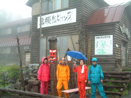 北横岳ヒュッテの前で記念写真を撮り山頂へ