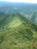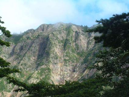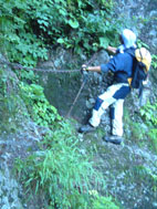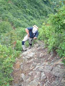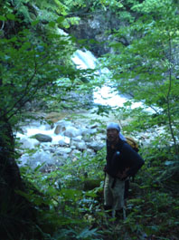 → → 登山口とKEN 八乙女の滝 渓流のクサリ場 → ![]() 途中でワラビを採るKEN 稜線に出た杉山ヶ崎 → ![]() 杉山ヶ崎への稜線 避難小屋(200m下に清水が在ります) ↓ ![]() 本名御神楽岳に着いたKEN & 伊佐須美神社の祠 ↓ ![]() 御神楽岳で疲れたSEI ↓ ![]() 藪越えが一時間ぐらい続く稜線 ↓ ![]() つばくろ尾根 ↓ ![]() 本名御神楽岳とKEN ↓ ![]() 山頂に咲いてた花 ↓ ![]() 残雪の谷底 ↓ → ![]() 熊打場の絶壁(クサリ場)を慎重に下る 前ヶ岳を右手に急坂を!! ![]() 山頂で左からKEN・SEI・今井さん・島津さん 今井さんと島津さんは山頂で会いました新潟の方です。 しばらくぶりにKENさんと二人だけの登山になる 御神楽岳は以前にKENさんと何時かは登りましょうと話してた山である お盆休みも終盤 15日に予定したが雨の予報に16日に延期 之が正解し天候に恵まれての登山になった。 本名ダムから林道に入り悪路を進む 左に霧来沢を見下ろし ガスが垂れ下がる中 登山口に車は走る しばらくするとガスが手品師の魔法に係った様にスーッと消えて行く 消えたキャンバスには御神楽に続く峰の切り立った画面が映し出され 私達は未だ見ぬ世界へと案内された。 登山口は林道の分岐点近くにあり 私達は車を分岐点に止め 帰りの東尾根下山に有利と判断する 身支度をし登山口に行くと既に車が二台在りどうやら今日の登山者は 私達を含め3パーテーの様である 澄み切った空と渓流は心を躍らせ 軽やかに動く足は KENさんを鼻歌の奏でる行動へと導いてくれた 15分程で八乙女の滝に着く 其処からは渓流の音を聞きながら平行に進む登山道 川を流れる水の音が遠ざかると急登が始まる ブナの大木やトチの木が見事だ 左に大スラブが見えて来ると杉山ヶ崎は直ぐ其処に 地図と高度計で確認して休憩を取る 最初のピーク948mに着くと稜線越しに帰りの下山道 東尾根が見える 地図には無い登山道を下る予定のため ![]() 熊打場より東尾根 位置を確認する(藪越えと沢の取り付き位置) 尾根を一端下り 登り介すと熊打場の道標 その先には直登のクサリ場が出てきた このころから晴れていた空にガスが充満? 展望危うし そんな中 目の前に避難小屋が 既に飲みきっていた水を補給するため 最後の水場(往復400m)でタンクを満たす 小屋からはほんのひと登りで本名御神楽岳に着いた 山頂はガスで視界はなく御神楽岳の稜線を地図とコンパスで確認 ※此処から御神楽岳までの稜線は崖の切り立った藪越えで危険です 休憩もそこそこに藪越えをして御神楽岳へ 右に滑落すれば谷底は間違いない 笹や木々で足がすくわれる 足元が全然見えないストックで木々をかき分け進む 疲れがピークになる 約1時間の難関を越え山頂に着いた 先に着いたKENさんがビールを出して用意万端 バテバテのSEIはビールを飲む姿に力がない お盆休みの飲み疲れか?? 11:05に山頂に着き13:30分までの長い滞在にも係わらず 気持ちが悪く食べ物が喉を通らないSEI作ったラーメンは手を付けずじまい 元気なKENさん 冷やしラーメンや食材を美味しいと隣で食べる 胃薬を飲み横たわるSEIとは対照的でした。 気付け薬(ウイスキー)を飲んで元気になるSEI そのころと同時にガスが切れて来た 遠望とは行かないまでも谷川岳の異名を持つ 姿が此処に現れる つばくろ尾根や水晶尾根・前ヶ岳の絶壁に身も心も奪われた KENさんとSEI 新潟から来てた今井さん島津さんと共に 山談義に花を咲かせてくれた自然の造形美に感激致しました。 13:30下山開始〜本名御神楽岳で小休憩 既に14:15分下山を急ぐ 最初は此処から東尾根を下山する予定でしたが時間を逆算すると無理と判断 同じ順路を辿ることにしました 足早に下り渓流沿いに着くと私達は初めての攻撃を受ける ”何の???小さな体の○○アブ” その数と言ったら数百匹がKENさんと私に群を成して襲いかかる 真っ黒な固まりと言いば想像がつくかな〜〜と思います。 耳元で唸る羽音 止まるや否やチックと一刺し 体中が赤く腫れて居ます 二人とも虫除けを忘れました 皆さん虫除けは必ず携帯致しましょう 楽しく奥会津の懐深い神秘の山に触れる事が出来ました 山頂で会った今井さん島津さん そしてKENさん 今日の日を有り難う感謝致します ・・・・・SEI・・・・・