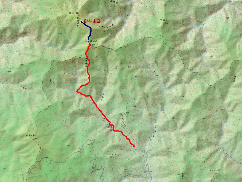 今回のコース 登り 登山口6:30 〜杉山ヶ崎8:40 〜 熊打場9:00 〜避難小屋9:20 〜本名御神楽10:00〜御神楽岳11:05 休憩 11:05〜13:30 下山 山頂13:30 〜本名御神楽14:15〜登山口17:15 全て休憩時間が含まれて射ます ※ 青のラインが藪越えです