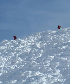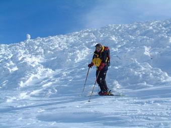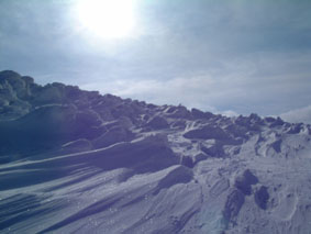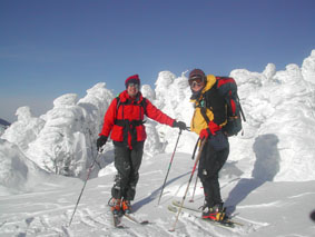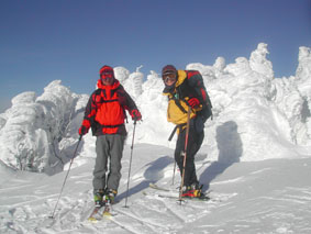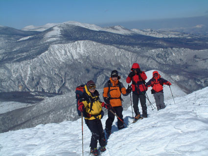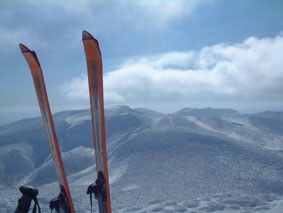 ![]() 白い世界の樹氷達 ゲレンデから磐梯山 ![]() ゲレンデからの展望 ![]() チョット一休み 左から すかがわ2嬢・OHGA・NOBU・Masa 後方の山 左奥から 西吾妻山〜東大巓〜東吾妻山〜一切経山〜吾妻小富士 高山1804.8m ![]() 山頂からの展望 左のピークから 矢筈森〜鉄山〜安達太良山〜船明神 中央のコルに黒い点(鉄山小屋) ![]() 立体感がありモンスターが動いてるように見える?? ![]() 山頂にて 左から OHGA・後に赤の?NOBU・すかがわ2嬢・Masa ![]() NOBU&すかがわ2嬢 (Masaさん提供) Masa&すかがわ2嬢 ![]() OHGA〜すかがわ2嬢〜SEI (Masaさん提供) ![]() 山頂の風景 (Masaさん提供) ![]() ![]() ![]() ![]() ![]() ![]() 山頂の休憩 熱めの燗が胃袋を起こす 決まってる ぜ (^-^) すかがわ2嬢 午後の斜景と太陽 ![]() コブを滑る 左 Masa・OHGA ![]() 午後の空に浮かぶレンズ雲 箕輪山は左足靱帯を切った思いでの山 (>_<) 5人のメンバーで山頂までスキー登坂 ゲレンデには岡部会長が待機(飲んでるのかな?)とKENさん 山腹は積雪が少なく山スキーには早いようで在る コブを避けトラバースをして登る 初めての山スキーはOHGAさん ベテランのMasaさんはシールが利かない様で苦労をしてる SEIは去年の苦い経験(シールが利かない)で新調したシールで快適 すかがわ2嬢さんNOBUさんは淡々と登る リフト終点から100°方位に直登を試みるがコブと傾斜がじゃまをしてダメ!! モンスターの間を斜めに進む 休憩時にスキーを外しツボ足で立つと太股まで抜ける雪面 表面はクラストしてるが未だ安定してないようである 青空の下 遠望を楽しみ登るメンバー小休憩を挟み11:35分に山頂に着いた 山頂からは360°の大展望 飯豊山も雲の上に顔を出す 写真に治めるが雲とピークが重なり輪郭が出ない デジカメの弱点は遠近感と白のコントラストと思いながらも便利さが優先して使用してる 山頂は弱風 雪のテーブルを作り食事 まずは中から暖めようと熱燗で一杯?2杯<?三倍・・・・数杯 (*^_^*) 美味しく頂く 続いてMasaさんの特製チーズ焼餅が出来上がる(焼餅の上にチーズこれを海苔で包む) Masaさんの話(家で焼いたときは旨くいったのだが (>_<)・・・)でも旨かったで〜〜す テーブルの上に お嬢様??が持って来てくれた漬け物やオレンジ 数分後には凍みオレンジにブロッコリンも凍りつく これが不思議と美味しいので在りました 皆さんの持ち寄った食材で満腹 下山の途に付く 滑降はコブに悪戦苦闘 転倒を繰り介し雪だるま (^_-) 予定時間を一時間オーバーしPM4:00駐車場でした 駐車場で待ちくたびれた岡部会長と合流 沼尻温泉に寄り入浴 酸性の風呂で暖まりご機嫌が良好(お酒を頂きました) 弱風の晴天下で山スキーを楽しんだ箕輪山登山でした ゲレンデの会長・KENさん・Hiromiさん NOBUさん・OHGAさん・2嬢さん・Masaさん またいぐべない(また行きましょう) 宜しく・・・SEI