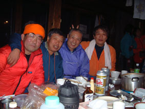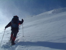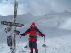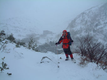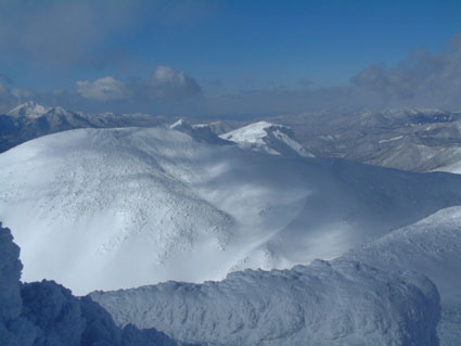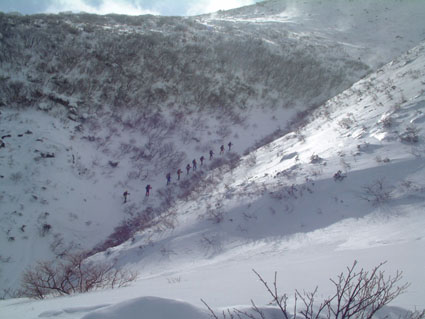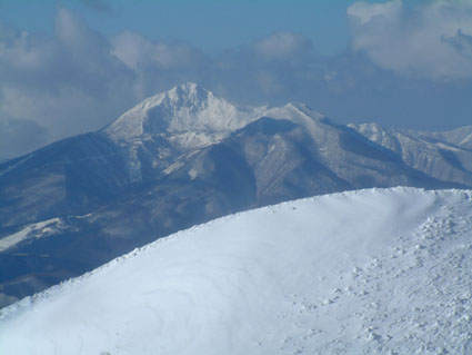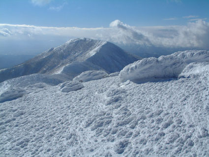 ![]() 奥岳登山口 一歩一歩 新雪を踏みしめ ![]() 勢至平の分岐にて ![]() 峰の辻分岐 塩沢分岐(後方にくろがね小屋が見える) ![]() ![]() くろがね小屋の夕べ 右端にK会長 埼玉県 蓮田山の会のメンバー(左端は別??TAKEで〜〜す) ![]() くろがね小屋 峰の辻分岐 大雪原をモクモクと登るTAKE ![]() 新潟から来た山スキー 一行の谷登坂 ![]() 山頂より和尚山 ![]() 山頂より後方 鉄山&TAKE ![]() 山頂より磐梯山 ![]() 山頂より後方 船明神 ![]() ![]() 山頂のSEI・TAKE ![]() 風 紋 ![]() 樹氷の唐松林??中央より下 ![]() モンスターとTAKE(仙女平分岐より上部) 正月最後の休みを利用して安達太良山へ 時折強く吹く風 小雪が舞う登山道 トレースが案内してくれる道 そんな3日の午後12:20奥岳登山道をTAKEとSEIが登り始める 前日に偶然に会い決めた山行きTAKEさんは2004年の発登山に成りました スキー場は過密状態のゲレンデ 駐車場も満杯で正月休みを名残惜しむように繰り出した人人 いつもは動いてるゴンドラが休し強風のためと思う 午後の出発の為か登山者には会わない 勢至平の分岐を過ぎた所で3名の下山者とすれ違うだけでした 小屋の状況を聞くと40名くらいの泊まり客らしい 話をすると偶然にも2年前に くろがね小屋でお会いした福島のMさんでした・・・しばらくぶりですと思い出を語る (^-^) くろがね小屋に着くと良い雰囲気で盛り上がるグループが居た 私達も食材をテーブルに準備 部屋に荷物を置き仲間入り 隣同士に盛り上がったのは 埼玉県から来た蓮田山の会のメンバー6人 山談義に話が弾み時間を忘れた一時と成りました 二度ほど温泉に浸かりPM8時に寝る 翌朝AM5時起床 早出の人達は準備に架かってた 外はガスで視界が悪い ただ天気予報では晴れそうであり期待できる 蓮田山の会のメンバーはAM7時過ぎ??に山頂に向かう 私達はのんびりと過ごす 朝湯に浸かり準備も整いAM9:00小屋を後にした 峰の辻分岐まで登ると視界が開け山頂がぼんやりと目に飛び込む どうやら私達の予報が当たったらしい(願望) 谷に目をやれば新潟の山スキーのメンバーが綺麗に列をなして登る姿を確認出来た 雪が少ないと言われる今年の山 山頂からの大斜面はスキーを持ってこなかったのが悔やまれるような絶好のコンデション 次回は山スキーにと思いを馳せた 途中で先行者の蓮田山の会のメンバーが下って来た 展望を心配して聞くと満足の山頂でしたとメンバーの笑顔が!! 大パノラマを写真に治めましたと下山して行く姿が安達太良山の雪原から小さく消える また何処かで合いましょう蓮田山の会の皆さん 連絡下さいね・・私達も埼玉へ (^_-) 山頂は強風で氷の顔面攻撃と突き刺す寒風 記念写真を撮り撤退 風よけを利用しビールで乾杯した が 寒くて半分も飲めませんでした (>_<) 下りはテンポ良く 時々抜ける足元 汗がにじみ出る 強い光線に目が痛い(サングラスを付ける) 仙女平分岐手前で5名の登山者と遇う 今日はゴンドラが動いてるようだ 少し下ると若い二人ずれスノボーを抱え登って来た 坪足の為 歩けないと話す 頑張れ若いのだから絶好の大斜面は直ぐ其処と言うと そうですねと素直な二人 好感の持てる若者が登って行った 薬師岳の山頂駅(ゴンドラ)で酎ハイを飲み休憩する あとはゲレンデを すたこらさっさ と下りるTAKEとSEIの正月登山でした これからは山スキーが主に成るがTAKEさん今年もヨロシクです ・・・・SEI・・・・ 蓮田山の会の皆さん元気に今年も山を愛してください またお会いいたしましょう