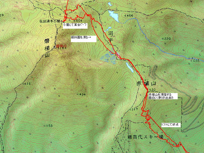 mineroスキー場よりリフトで終点〜赤埴山〜沼の平〜コル〜黄金清水〜弘法清水(小屋で休憩下山) AM 9:20リフト終点より登る〜小屋休憩(??時間)〜mineriスキー場 PM 2:30に下山でした
