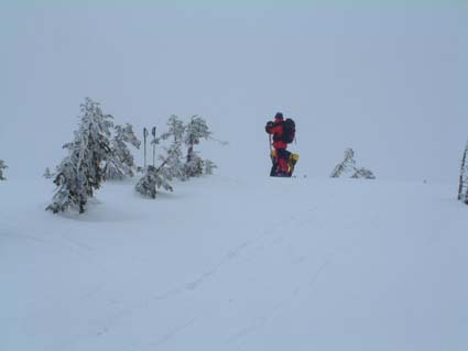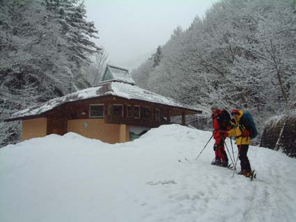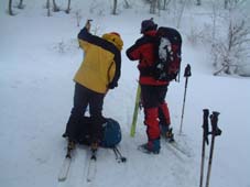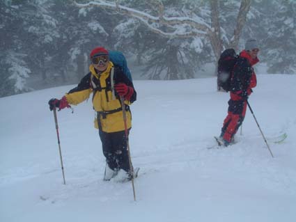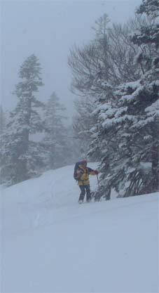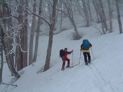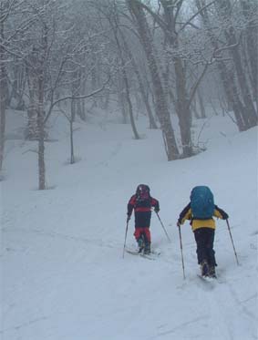 ![]() シールを貼り替えるAN右 最初の谷を登るAN&Ojyou ![]() ブナ&楢林を小雪舞う中の登り ![]() ANシールが利かず坪足で登る ![]() 前を行くOjyou(中央) ![]() ガスが架かり視界が利かない ![]() 2015m付近のAN&Ojyou ![]() 駒の小屋付近と思った場所でシールを外す が 手前のピーク2015mでした(駒の小屋は2053m) ![]() パウダースノを滑降する Ojyou & AN ![]() 振り返りシュプールを撮る ![]() 谷下りをする前に休憩のOjyou & AN 1350m付近 ![]() 夏道に架かる登山道の階段 小雪舞う南会津 登山口にはAM7:00シールを付けて出発 滝登山口には先行隊の車が一台(宇都宮ナンバーを見て もしかして東北MLの”まつおかさん”)違いました 天気予報は雨か雪 予報は当たり一日中小雪が舞う日に成りました 上の沢筋を登り尾根に取り付く此処は最初の難関 今日はシールが利き良い感じ しかし何かあるのが私達のメンバーANさんのシールが利かずスキーをザックに付け登る 抜ける雪面 進まぬANさん 尾根に出るのに四苦八苦 もうダメと大汗の谷登りでした 夏道と交叉する尾根1400m付近(テレビのアンテナあり)に付き小休憩 Ojyouの美味しいフルーツをパクリと頂く 此処までの時間は登り初めて2時間まあまあかなと!! これからの行程を確かめるため地図を眺める急登の連続にため息 フー頑張るか!! 斜面がきつく一度滑ると止まらない OjyouとANさんが やっと登った急斜面を転げ落ちる 止まらない こんな時はどうして止まる 方法は???とANさんが!! 1800m付近まで登ると先行隊のメンバー(登山口に在った宇都宮ナンバー)が下って来た 格好良くシュプールを描き 3名のスキーにボーダーが一名のグループ Ojyouが挨拶を交わす 話では森林限界までで引き返したと話される 同世代のメンバーと思うグループに Ojyouが私達は老人会の者ですと笑いを誘う 話に一時の交流を持つことが出来 別れた 森林帯を抜けるとホワイトアウトで方位がつかめない地図とGPSで位置を確認 駒の小屋付近と断定(所が手前のピークでした)記念写真を撮り下山 風が当たらない場所を選び食事にする ツエルトを張り雪よけを作る テーブルを作るためスコップで掘るが柄が抜ける 笑う 力が入らない(しゃりバテのSEI) 此処で体調悪いSEI足が痛む食欲が無い(リンク在り) 温かいうどんを美味しく食べるOjyouとAN コッヘルに分けて貰うが喉が通らないSEI 大好きなお酒も飲めない 美味しいとANさんがビールを飲む 40分位の休憩で滑降開始ザラメの上に10cm位の積雪 パウダースノーの斜面は 気持ちよくスキーが走る 右に左に急斜面を流れるように滑る格好良い二人の姿を 体調不良のSEIが後を追う ブナ林の間をこんなに気持ちよく滑れるのは めったに無い ANさんの一言 俺スキーが旨くなったね 其処でOjyou ん〜〜旨くなったね 雪質が良いからね・・・・・ 2015mから1500m位までは最高の雪質でした 下の沢に向かって下る谷筋は雪がクサリ急ブレーキが架かる 急坂の為 斜滑降で下る 滝の手前でトラバース 林道に出て登山口に向かう 林道は所々で雪崩があり危険個所が多い 夏道の登山道にある階段に着きOjyouの記念写真を撮り全行程を終えました しゃりバテのSEI 大変ご心配をお掛けいたしました Ojyouさん ANさん 懲りずに一緒に行きましょうね・・・反省・・SEIでした。 |