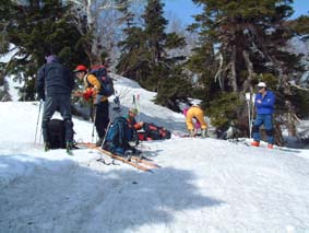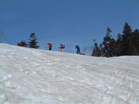 ![]() 朝焼けの峰 八甲田温泉(遊仙) 雪の壁が続く 宿泊の場所 ![]() いよいよスタート Mさん M奥様 すかがわ2嬢さん ANさん リーダーOさん 青空の下 猿倉岳のすそ野を登る 最初の休憩(美味しいパンご馳走様でした) ![]() 北八甲田山の峰々 後方の櫛ヶ峰を遠目に気合いを入れるメンバー ![]() 櫛ヶ峰山頂で SEI〜Ojyou〜AN〜OKA〜M&M ![]() 遠く霞む岩木山の姿 昼食を終えて下山準備 ![]() 八甲田山山頂駅より櫛ヶ峰 ![]() ![]() ![]() フォレストコースを滑る前にハイポーズ Ojyou〜ANさん 途中でMさん すかがわ2嬢さん OKAさん ANさん Mさん![]() 北八甲田山(大岳・小岳・高田大岳) 初めての八甲田山 山スキー 地形&ルートを捉えていない為に周りの景観を楽しむ余裕が無かったが リーダーOKAさんの案内で楽しい山歩きが出来ました Mさんご夫婦の合流で6名のメンバーが櫛ヶ峰を目指しスタート 強い日射しが降りそそぐ ツガ林の緩斜面を越すと駒ヶ嶺が見えた 奥には銀白色の櫛ヶ峰が鎮座 裾のが広がる雄々しい姿にしばし佇む 未だ届かない処女登山の峰に心がはやる そこには数名の登山者の稜線を登る姿が在った |
