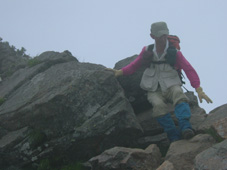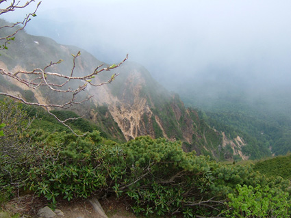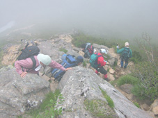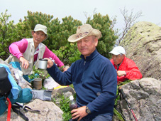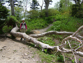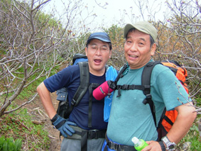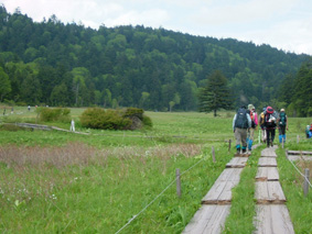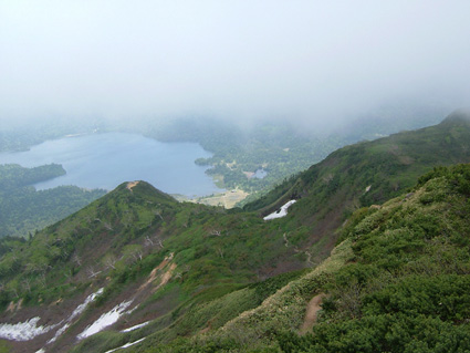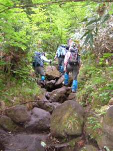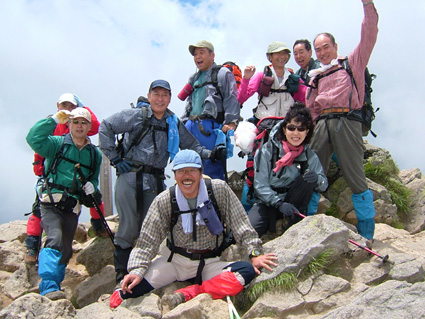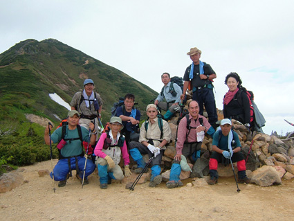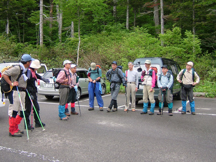 ←尾瀬沼 ![]() 尾瀬沼のワタスゲ ![]() テン泊のMasa&OHG 御池駐車場登山口に勢揃い (@_@) KEN・Hiromi・HIRO・HARA・TETU・SUMI・岡部会長・MASA・Tukasa・OHG ![]() 御池登山口分岐 いきなりの急登 広沢田代にてMasa ![]() 1900mピークより広沢田代 後方に燧ヶ岳(MASA&OHG) 池塘(熊沢田代) ![]() 熊沢田代の木道にて休憩 KAN・Hiromi・OHG・HIRO・TETU・SUMI・Masa・Tukasa・HARA ![]() 雪渓あるき 2100m登山道より熊沢田代 後方奥には会津駒ヶ岳 ![]() 元気なSUMI&TETU 柴安ーの切落ちた岩稜 ![]() ![]() ![]() ![]() 山頂の一時 HIRO・KEN・Hiromi・MASA・TUKASA・HARA・OHG MASA・SEI・HARA・TETU・SUMI・HIRO ![]() 山頂で〜〜す ![]() 下山 奥に尾瀬沼 中央にミノブチ岳 ![]() ![]() 岩場を下る 振り返り燧ヶ岳のピーク ![]() ミノブチ岳にて KEN・SUMI・TUKASA・SEI・Hiromi TETU・MASA・OHG・HIRO・HARA ![]() ![]() サンカヨウ キヌガサソウ(拡大) ![]() 途中に岳樺の倒木が ![]() 沼の平 御池駐車場にテン泊した3名 檜枝岐の民宿に3名 早朝組5名 の総勢11名の参加 早引き(会長は早く帰る)1名は尾瀬沼を探索後帰宅と各自のコースを設定した 6月例会登山(幹事HIRO)の幕開けでありました 夜間はテントに激しく叩きつける雨 明日は雨の中の登山とテントの中で!! 早々とMASAが起床 モーニングコーヒと外で独り言 聞こえるが起きないOHG&SEI 6時にムクムクとテントから出る二人 雨は止み爽やかなあさである フキの葉が雨に濡れて瑞々しい 鳥のさえずる声が朝靄の空気を振るわし響く キツツキの幹を打つ音が朝の目覚ましと成ったテン泊組の夜明けです 準備を整えて駐車場のカウンターの取り付けてある登山口を渡ると ブナの巨木が目立つ岩がゴロゴロしてる 直ぐに湿原がありミズバショウの大きな葉が所狭しと群生していた 登山道は雨上がりの為か悪路で滑る 木の根に上がり靴を滑らすOHGさん あぶない〜〜 と (>_<) 一時間ほどで広沢田代に着き一休み ワタスゲやイワカガミ・タテヤマリンドウ・チングルマなどが 咲き(まだまだ咲いていたが名前が解らない)行き交う登山者の目を楽しませてくれる 目の前のピークを越すと燧ヶ岳の全貌と熊沢田代が現れるはずである 蒸し暑い汗がわき出す拭っても拭っても汗!! 当然の如くビールを取り出しグビィーと喉奥に流し込む はらわたまで通る清涼感 これが堪らない道草の微笑みは至福の一こまでした 木々をくぐり抜け現れた湿原 奥には3筋の放射線状に雪渓が残る燧ヶ岳!! 西には越後の名峰が連なる 北に会津駒ヶ岳 東には田代山〜帝釈山と展望を追う 目の前に池塘 風に誘われゆらゆらとワタスゲ 池ではカエルが合唱する 小さな魂が語りかける 心を開き自然に戯れ 湿原の持て成しを堪能致しました 木道を渡りきるとダケカンバと笹藪が入り込む道に 目先には先ほどの雪渓が現れ階段状に 掘られた跡を確実に登る 道標のある小さな空間で振り返る!!眼下には熊沢田代が輝きを放してた ゴツゴツした大岩を登ると山頂に着いた 山頂では20人位の登山者が時折吹く強風に キャーキャーと帽子を飛ばされての悲鳴でありました 山頂の展望はガスが次々と流れスライドを見てるように景色が移り変わる 至仏山〜尾瀬ヶ原〜尾瀬沼〜等が見え隠れする様が不思議と心に写り感動するのでした 休憩を楽しみ長英新道を下る 途中ミノブチ岳で記念写真を撮る 下山道には花々が群生してる 大きなダケカンバの倒木 なが〜〜〜いくだりを終えると尾瀬沼が ワタスゲの白が木漏れ日に照らされ沼一面に散りばめられた宝石の輝きに魅える。 沼の平を足早に沼山峠へ 峠の休憩所は登山者の憩いの場所として開放されて居た 当然の如くビールを求めて噴き出す汗を拭こうともせず飲むSEI 間もなく全員下山 燧の湯で浸かり立ち蕎麦を食べ帰途に着く 参加者の11名の皆さんありがとうございました ・・・SEI・・・ 戻 る |