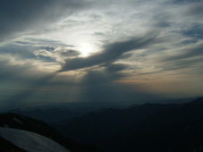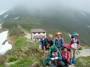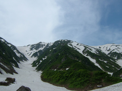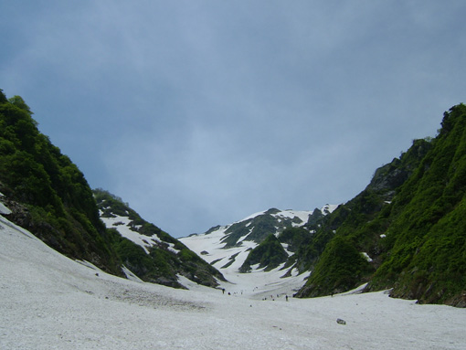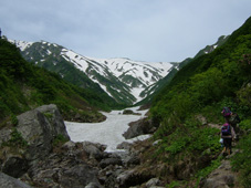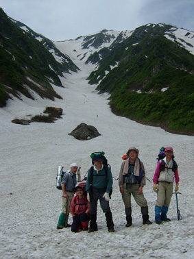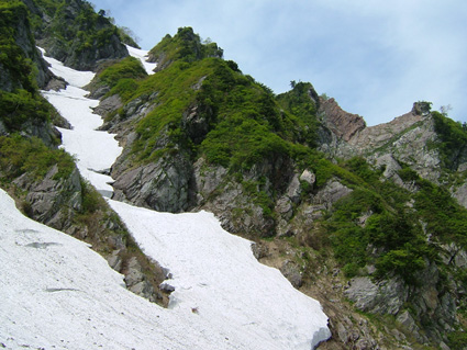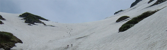 ![]() 石転び沢の全貌 左から Masaさん TANさんは初めての石転び沢(憧れの山) ANさん すかがわ2嬢さん ![]() 温身平(後方稜線は梅花皮〜門内) TAN・AN・Masa・Ojyou ![]() 朝食(AN・TAN・Masa)Ojyou提供写真 (@_@) ![]() ![]() ![]() 砂防ダム〜緑が濃くなった登山道〜下つぶて石 ![]() 梶川の出合いで一度は雪渓に乗るが?? ![]() ![]() ![]() 空洞のスノーブリッジ 〜 直ぐに夏路に取付く 〜 上つぶて石 ![]() 石転び沢(中央に大岩) 例年になく緑が濃く見える幸七尾根(中央 宮城の山仲間・Ojyou・AN・TAN・Masa (^O^) 良い天気だない ![]() ![]() ![]() 足取りが重い 斜度が増す沢 浮き石とじゃれるOjyou ![]() 幸七尾根の岩盤に張り付く木々 ![]() 点々と人影が石転び沢を!! 上を見上げると梅花皮岳方向より落石が 凄い勢いで転がって来るのが見えた 直ぐにラークと大声で数回叫ぶ 落石の転がる方位に二人のスキーヤーが居る 気づかない 又 大声で叫ぶ 気づいてくれた 慌てて二人が落石を避ける 一人が転倒する スキーが外れスキーアイゼンも外れずれ転がり落ちた が 直ぐに止まり 事なきをいた 石転び沢で未だに落石が無かった事は無い (@_@) 十二分注意をしたい。 ![]() 中之島にて休憩 いよいよ最後の昇りMasa〜AN〜Ojyou〜TAN〜宮城の山中間 ![]() 梅花皮小屋から大日岳 ![]() 梅花皮岳 梅花皮小屋 SEI〜TAN〜Masa(下段にAN〜Ojyou) ![]() ![]() 北俣岳山頂で TAN〜Masa〜AN〜Ojyou〜一人気取って^^;SEI(後方は大日岳) ![]() ![]() ギルダ原を行く 梅花皮岳&北股岳 ![]() ![]() ![]() ![]() 門内小屋にてOjyou・Masa・TAN・AN (AN&Ojyouのお笑いが始まる) ![]() 赤い屋根の門内小屋 日本海に落ちる夕日(なぜか寂しい) ![]() 二王子岳に夕日が射し込む 金曜日(4日)のPM7:00郡山を出る 喜多方〜小国〜飯豊山荘登山口へPM10:30頃に到着 早々テン泊の準備 夕ご飯&宴会を早めに切上げ眠りに付く 5日AM5時起床 朝食は砂防ダムで取ることにして出発 朝から日射しがある天候に足取りも軽い 新緑のブナ林を進み 登山道に咲く花を鑑賞 温身平より飯豊の峰を覗き渓流の流れに送られ砂防ダムに着いた 清々しいマイナスイオンが体を包む 無尽蔵に湧き出る自然の宝庫 飯豊連峰の恵み 憧れの飯豊(石転び沢)にMasaさんTANさんが訪れた 食事を済ませ階段のある砂防ダムを登り登山道に取り付く 満タンに貯めたダムの清流は青く 形相が底まで透き通り見える 贅沢な持て成しを受け梅花皮沢の夏路を登る 去年の事故はこの辺かなと小さな滝が流れ落ちる場所で呟く”合掌” いつもなら雪渓歩きをする梶川の出合い スノーブリッジもなく勢いよく流れる雪解水 滑る岩を慎重に渡る ANリーダーが手を差し伸べ無事に渡ることが出来た 門内沢の出合い手前で雪渓に取り付きようやく雪の感触を味わう 大岩は背丈以上に露出して いつもなら腰を下ろして休憩する場所が見上げる位置に遠ざかる(大げさ) 所々には大岩を思わせるような巨岩が頭を出していた 出合いで休憩をして ・・さあいよいよ石転び沢の本領発揮 近くに見えて届かない梅花皮小屋へ登坂開始 雪が腐り適度なカットが歩きやすい 本石転び沢付近に大きなダケカンバの倒木が休んでいた 自然の力は凄い 幹回り1m以上はあろう巨木がバリバリと むしりちぎられた様な断面に驚く ギョ @_@ 中之島で休憩 最後の踏ん張り 胸突き八丁の急登を感激深く登る 一歩一歩 之が石転び沢 之が無ければただの沢と言い聞かせながら いつもの味わいを今年もありがとう 石転び沢・・・・SEI 梅花皮小屋にメンバーが到着 小休憩後 北股岳〜門内小屋へと足を運ぶ 途中お花畑の解説(Ojyouさんの)を聞きながら 見事に咲き誇る花々に飯豊の夢を頂き小屋に到着 夕日が沈む様 落日を浴びる二王子岳を眺め小屋に入る 小屋には宮城で(不忘山 山スキーで出会った方)知り合った先客と秋田の登山者の二組 其処に私達5名&途中からご一緒に仙台の方1名 後から新潟山岳会のメンバー8名??が合流 宴会の席が出来上がりました 食事を済ませ 小屋のメンバーは一体になり山談義とAN&Ojyouのお笑いに終始致しました。 午後8時 5日の全行程を終了 門内小屋の閉店と成り心地よい疲れ 爆睡する闇夜に静けさが宿りました ・・・時々 歯ぎしりがあり・・・・6日の門内岳〜丸森尾根に続く ” SEI ” (^_-) 戻 る |