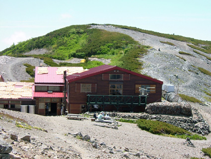 蝶ヶ岳ヒュッテ(後方は蝶の最高峰2677m長塀の頭)