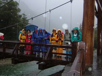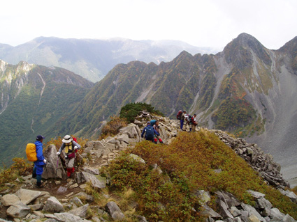 ![]() 上高地ターミナルにて 河童橋 HARA・AN・HAYA・Sho・TAN・OHG・MASA TAKI〜ojyou〜Miho 雨の中 予定時間に出発する事が出来た 二時間ほどで雨も上がり雨具とおさらばでき軽快に歩くことが可能になる 梓川沿いを 明神〜徳沢〜横尾と進む ![]() 横尾大橋 TAN・AN・MASA HAYA・Ojyou・Sho・HARA・OHG MIHO・TAKI ![]() 屏風岩 横尾から本谷橋に進むと左に屏風岩の圧倒される岩峰が現れる 左左と巻くように進む 朝の雨の洗礼を受けた木々や草は瑞々しく大地の生命を感じる!! 倒木や岩の姿に目をやれば其処にはキノコの列が 背伸びした草を分け覗き込むとシメジやオリミキの固まり 美味しそうと逸る気持ちを抑え 登山道を進むSEIでした。 本谷橋 涸沢のテント場 本谷橋の下を流れる清流に 疲れを癒す登山者の姿が多く見られ 横尾から涸沢小屋までの中間地点に位置する場所はオアシスの様な光景で在る 涸沢に到着!! 色とりどりの傘を開いた町並みの一角を思わせる風景 大都心の流れがそのまま移動したのかと錯覚さい憶える ![]() ザイテングラードより北尾根 ![]() 左奥に常念岳〜右の端に蝶ヶ岳 朝の雨は上がったが垂れ込めたガスが遠望を遮る 辛うじて常念岳や蝶ヶ岳の姿を確認 振り返り穂高岳を見上げるが 穂高山荘の姿を確認出来るに止まる悪戯なガスに 登りきる頃にはサヨナラしてねと祈るように目的地に向かう仲間の姿が・・・・ ![]() 前穂高岳 & 涸沢 涸沢岳山頂にて Miho・AN・SEI・Ojyou 前穂高岳の姿を稜線越しに見つめ穂高山荘に着いた 流れるガスに覆われ 見渡す目先に映るのは輪郭のない山肌と登山道 足元を見つめOjyou・AN・Miho・SEIが涸沢岳の頂上に登りきるのに時間はさほど必要では無かった。 次のページへ |