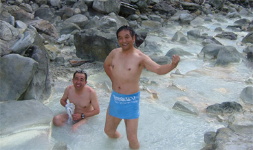 秘湯は豊富な川となり惜しみなく流れ去る 温度は40°位で所々から高温の沸湯が吹出す