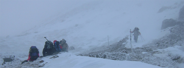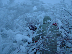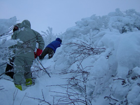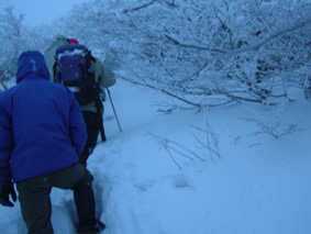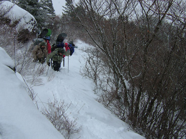 例年の今時期 夏道は雪の下(道標が出てる) ラッセルして登るメンバー ![]() 休憩(早くも右手にはアサヒBー?)(Taさん・Take君・Tosiさん・Sato君) ![]() 渋谷さん Taさんのザックは20数キロ) Yosiくん〜Take君〜Sato君〜Yosinori君〜Taさん Tosiさん 分岐にて(Taさん) 弘法清水に着いたメンバー疲れて座り込む ![]() ![]() ![]() 小屋の中では年末年始のお祝いを繰り広げる ![]() ![]() ![]() 元旦 弘法清水小屋を6時に出発 積雪不足でヤブ越え山頂へは7:20到着 途中で一瞬ガスが消えるが!!日の出は雲の中 ![]() 山頂にて Yosinori君・Yosi君・Sato君・Take君 前の黒いウエアーはSEI Tosiさん・Taさん (@_@) 弘法清水 太陽が微かに顔を出す(弘法清水小屋) ![]() 下山時に地吹雪で視界が消える (ゴーグルは凍り付き眉毛は霜柱に) ![]() 猿ダンゴでは在りません!!強風で岩にしがみついてるのです (スキーを外し下山するTaさん) ![]() 櫛が峰の稜線が瞬時浮かぶ ![]() 沼の平らまで下れば風が弱くなる Taさん・Take君・Sato君・Yosiくん・Yosinori君 ![]() オープン前のゲレンデに着く(猪苗代湖に厚い雲が垂れ込める) シュプールを残し下る ![]() 午後の川桁山の峰(山頂は雲の中) 年末年始登山(磐梯山)に31日AM6:45郡山を発つ 天気予報では日本列島が大荒れ 気象状況では下山しましょうと渋谷さんの家族6名+SEIが弘法清水を目指す 登山口では未だ晴れ間も見えたが赤埴山をトラバースする頃は雲に覆われた磐梯山 次第に雪が降り出し新雪が行く手を邪魔する 渋谷さんの家族は重い荷物を物ともせず背負いラッセル力強く進む SEIは積雪不足の夏道を山スキーで登るが悪戦苦闘 スタミナ切れでペースダウン 磐梯山のこの時期に今までにない雪不足 山スキーは無理でした 沼の平らは渡ることも出来ず夏道を行く! 櫛が峰のコルも岩が出てる! 黄金清水付近は吹きさらしで雪が付いて無い! 弘法清水小屋は雪から姿が完全に出ていた(通年は雪に覆われてる) 小屋に着いたメンバーは疲れて腰を下ろし暫し休憩する 小屋に入り今日の宴会の準備 まずはビールで乾杯 渇いた喉には効きます 五臓六腑に染み渡る磐梯の味が!! 次には熱燗 瞬く間に1.8Lのお酒が消えゆき2本目に(お酒ゆえ一本でなく日本(2本)・・・め)(>_<) 渋谷Taさんのお笑いもお酒が進むに連れて盛り上がる小屋の中でした 翌朝AM6時小屋を出発〜山頂には7:20到着する 山頂は雲に視界を遮られ日の出は拝むことが出来なかったが山頂の祠に手を合わせ 2005年の願いを込めて手を合わせるメンバーの姿が眩しく映る元旦の磐梯山頂に!! 小屋に戻り朝食を取り10:30下山開始 地吹雪の中を下る 行く手は容赦ない強風によろめく 顔面攻撃の氷結 ゴーグルは凍り見えない外すことも出来ず 座り込むメンバー 年始の磐梯山は私達に2005年の洗礼を施すのでした 沼の平らまで下ると風も弱くなり休憩をする 通年は沼を渡るのだが渡ることが出来ない沼 沼越しに見えるはずの裏磐梯は姿が無い 心地よい疲労感にしたりオープン前のゲレンデに着いたのは既に12時を回った後でした 湿った深雪は疲れた足に容赦ないダメージを与える Taさん親子は素晴らしいスキー&ボードtechnicにて華麗に滑り降りた が・・・ SEIは疲れた足に踏ん張りが利かず二度の転倒(でも気持ちいいシュプールが嬉しい) 今年の発登り初滑りが完結致しました 渋谷さんご一家様 本当にお世話になりました 又宜しくお願いいたします Yosinori君 4月にヨロシクね・・・内緒・・・私は異国の地で・・・Y 楽しく過ごした年末年始磐梯山登山でした ・・・SEI・・・ 戻 る |